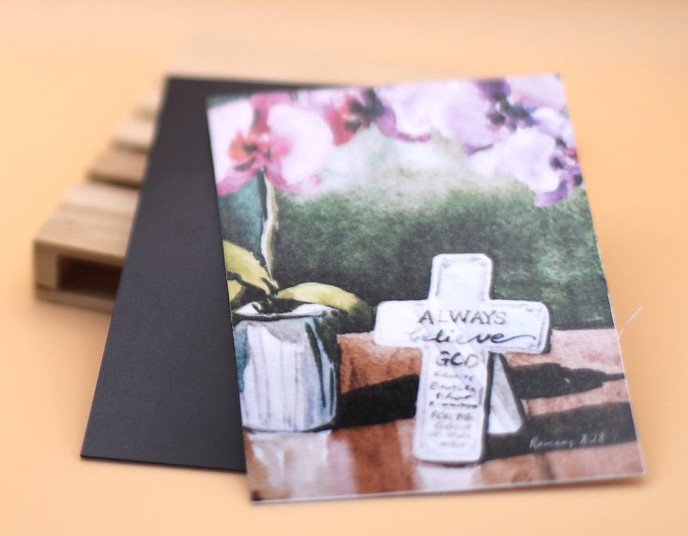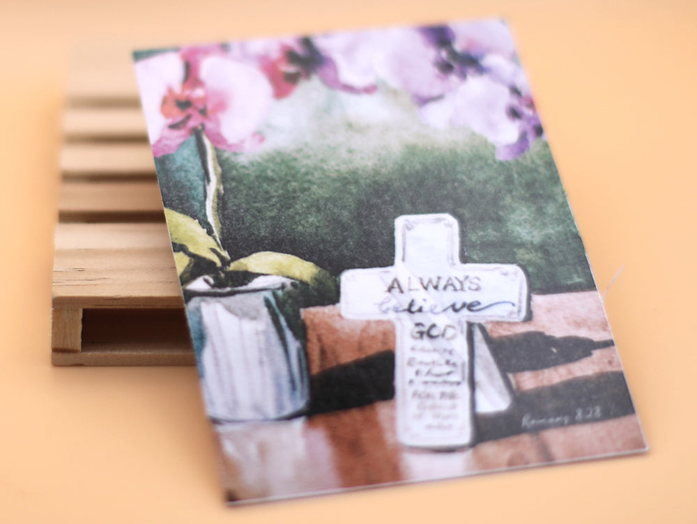 Uplift your space with this inspiring magnet featuring a hand-painted watercolor of a blooming orchid and a tabletop cross. The message “Always Believe God” is gracefully woven into the design, paired with the reassuring verse from Romans 8:28 (NIV): “…God causes everything to work together for the good of those who love God…”