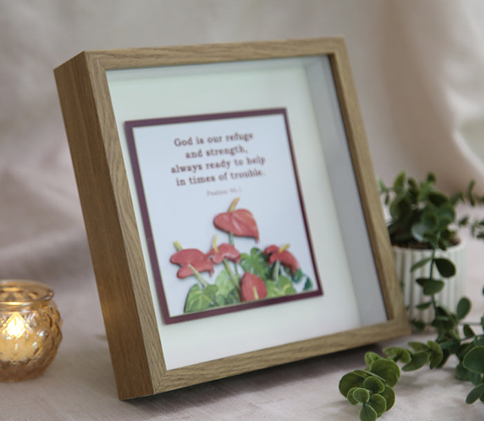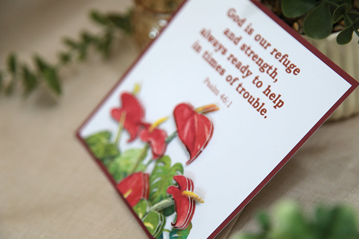 Our 'God is our Refuge & Strength' 3D Card offers a powerful message of faith. A hand-painted watercolor anthurium, carefully layered to provide a captivating, raised 3D effect, against a cardstock backing. The distinctive height of the anthurium against the flat background draws the eye, and the subtle interplay of shadow and light enhances the overall depth and drama of this special, handcrafted card. Psalm 46:1, "God is our refuge and strength, always ready to help in times of trouble," is prominently featured, offering a tangible reminder of God's ever-present help. This card is an ideal way to uplift someone facing challenges, providing them with a beautiful reminder of His strength and refuge.