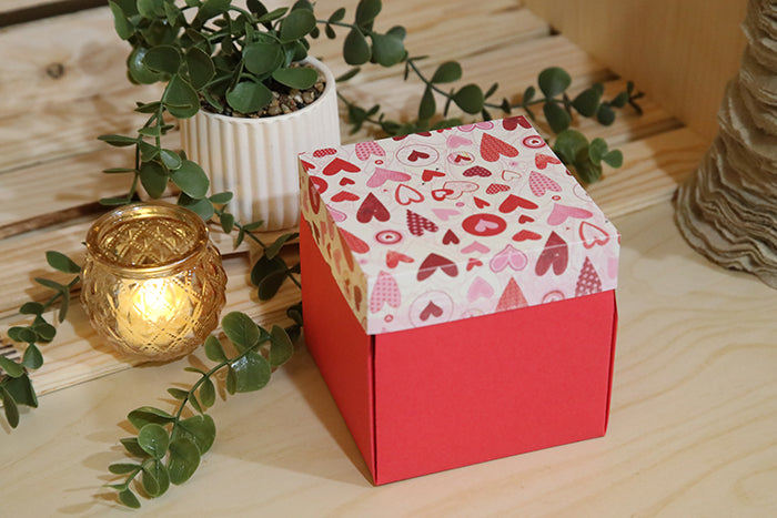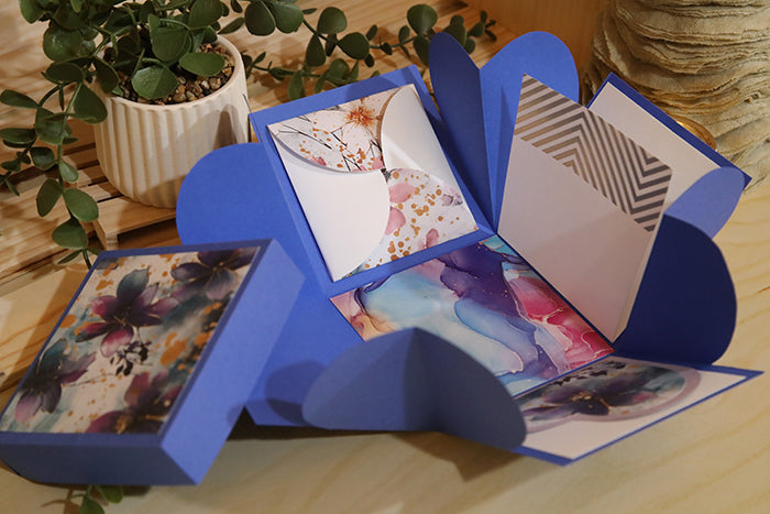 Every 4" x 4" x 4" cube is made entirely by hand with love and care. When the lid is lifted, the layered sides dramatically explode outward, revealing a beautiful, intricate arrangement of unique paper panels, pockets, flaps, and tags.