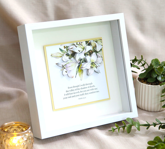 Find comfort and assurance in God's unwavering presence with our "His Comforting Presence" 3D Handmade Card. This exquisite notecard features a delicate, hand-painted watercolor bouquet of white lilies. Each bloom is meticulously layered to create a captivating, raised 3D effect that adds depth and dimension to the design. The card beautifully displays the reassuring verse from Psalm 23:4 “Even though I walk through the valley of the shadow of death, I will fear no evil, for you are with me; your rod and your staff, they comfort me.”