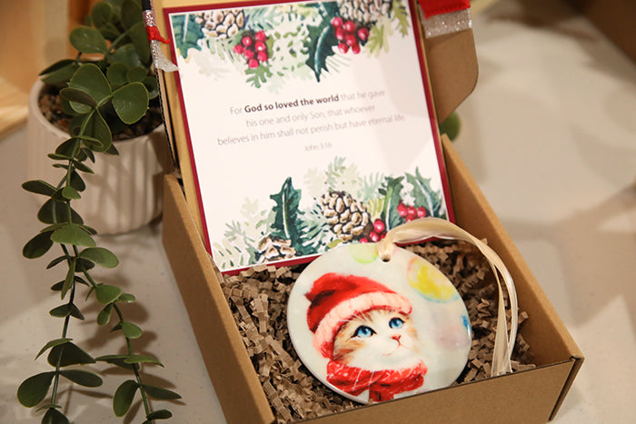 Add a sprinkle of feline charm and holiday magic to your Christmas tree! This unique ceramic ornament features a captivating watercolor painting of a cat in a festive Santa hat and red scarf. The curious kitty gazes up at a flurry of colorful, magical bubbles, perfectly capturing the whimsical wonder of the holiday season.