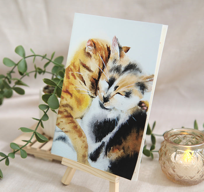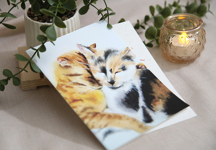 Show you care with this heartwarming set of five cards, each featuring an adorable watercolor painting of two cats in a tender embrace. The "Two Cats" Love Card Set is perfect for any occasion—from expressing love and care to sending a simple note of encouragement. With a blank interior, each card provides the space for your personal message, making it a versatile choice for any cat lover or anyone who appreciates a sweet, heartfelt message.
