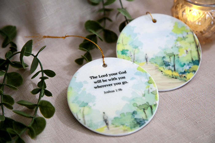 One side of the ornament features this serene scene, while the other side carries a powerful message of faith and encouragement. You can personalize it with a favorite verse, or use our suggested message from Joshua 1:9: "The Lord your God will be with you wherever you go."